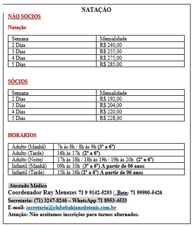 Matrícula na secretaria do clube. Horários: 8h às 12h/ 14h às 18h.